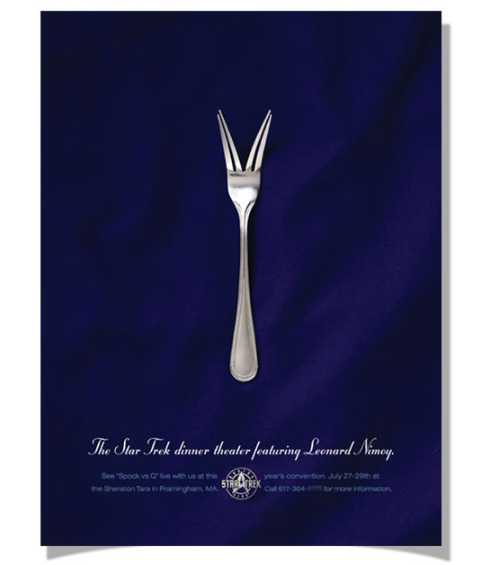 See “Spock vs. Q” live with us at this year's convention. July 27-29th at the Sheraton Tara in Framingham, MA. Call 617-304-____ for more information.